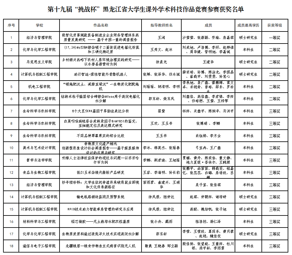 近日,由团省委、省科学技术协会、省教育厅、省科技厅、省社会科学院、省学生联合会主办,东北石油大学承办的第十九届工银融e行 “挑战杯”黑龙江省大学生课外学术科技作品竞赛评审结果公示发布。万象城代表队斩获一等奖1项、二等奖5项、三等奖12项。