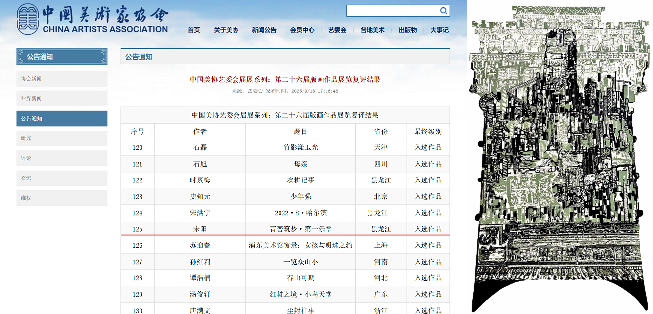全国版画作品展览由中国美术家协会主办,每两年举办一次,是国内版画艺术领域最具权威性和影响力的版画展览。本届展览坚持“学术性、思想性与艺术性并重”的评审原则,最终遴选出228件精品力作。我省共有17件作品入选,宋阳老师的作品位列其中,这也是宋阳继2024年入选第十四届全国美术作品展览之后获得的又一重要奖项。