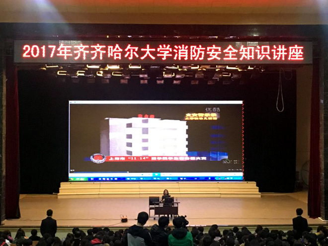 市消防支队大校李清江、市消防支队重点科科长刘环宇、保卫处处长吴刚、副处长刘增发、学生处副处长张树启、舍务管理科同志、全体公寓管理员及公寓辅导员、舍管会学生干部以及学生寝室长代表1300多人聆听了讲座。讲座聘请齐齐哈尔市消防支队女子宣讲团崔丹同志主讲。