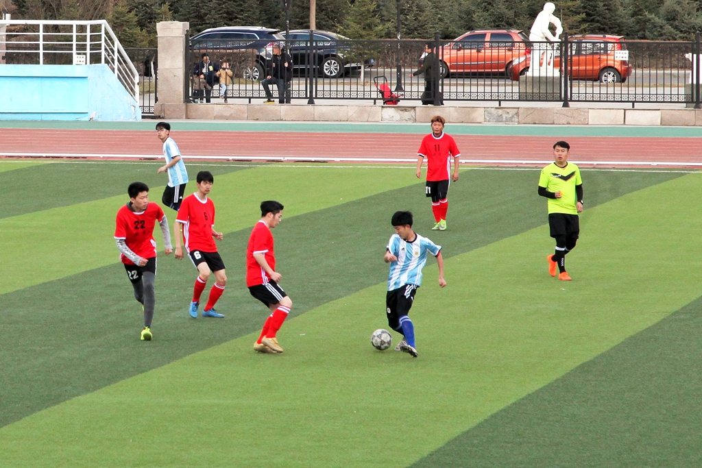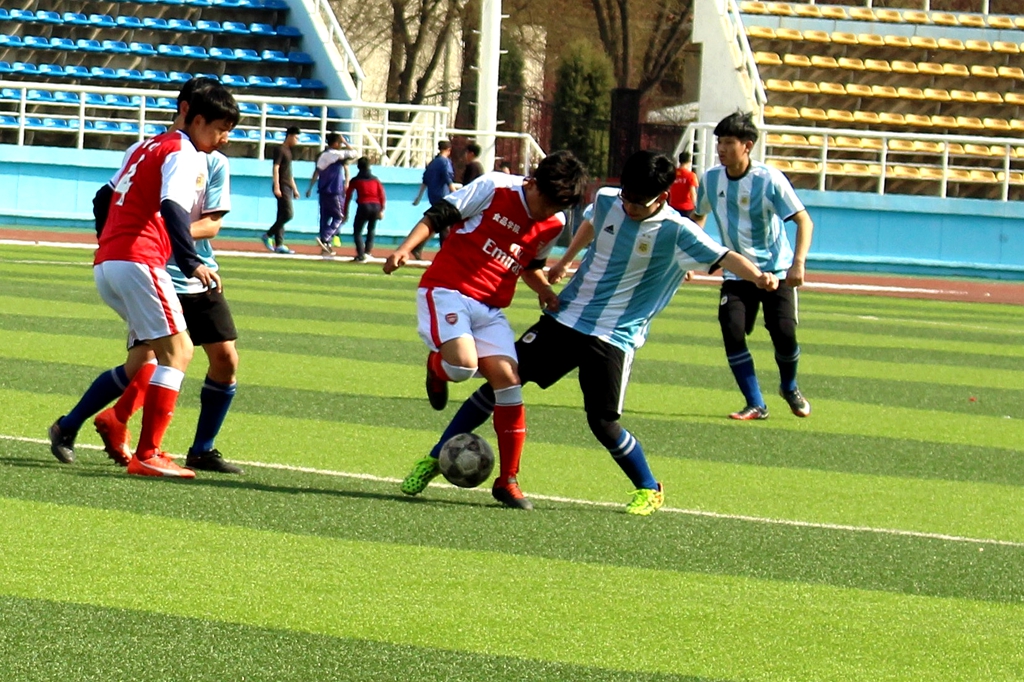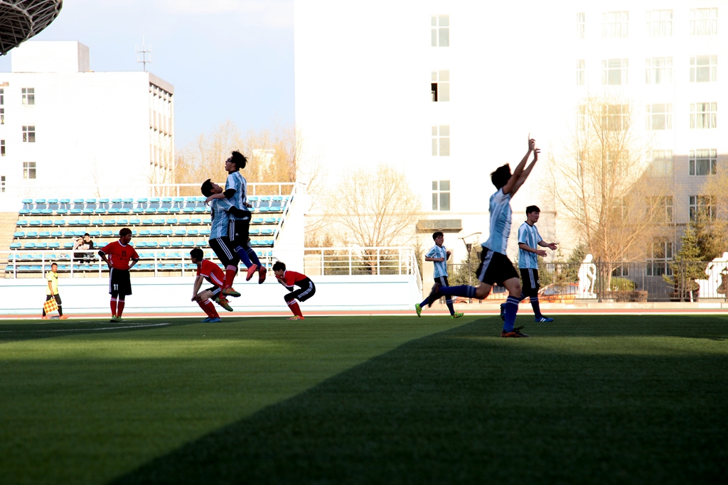只听裁判一声哨响,国际教育学院和音乐与舞蹈院双方队员便开始了激烈的“战争”,可以看出双方都尽量保持自己的最佳状态,“克鲁伊夫式过人”、“牛尾巴”、“蝎子摆尾”、“踩单车”以及各种假动作在赛场上都表现得淋漓尽致,而比赛也十分振奋人心,令人大呼有一种在看欧洲杯的感觉。赛程过半,中场休息时分,双方球员仍在为比赛而努力制定新的战术,调整各自的状态。下半场比赛开始,国际教育学院暂时占得上风,运球、传球、踢进门等一系列动作尽显整个团队的十足默契。最终,国际教育学院凭借着较高一筹的配合胜出比赛。