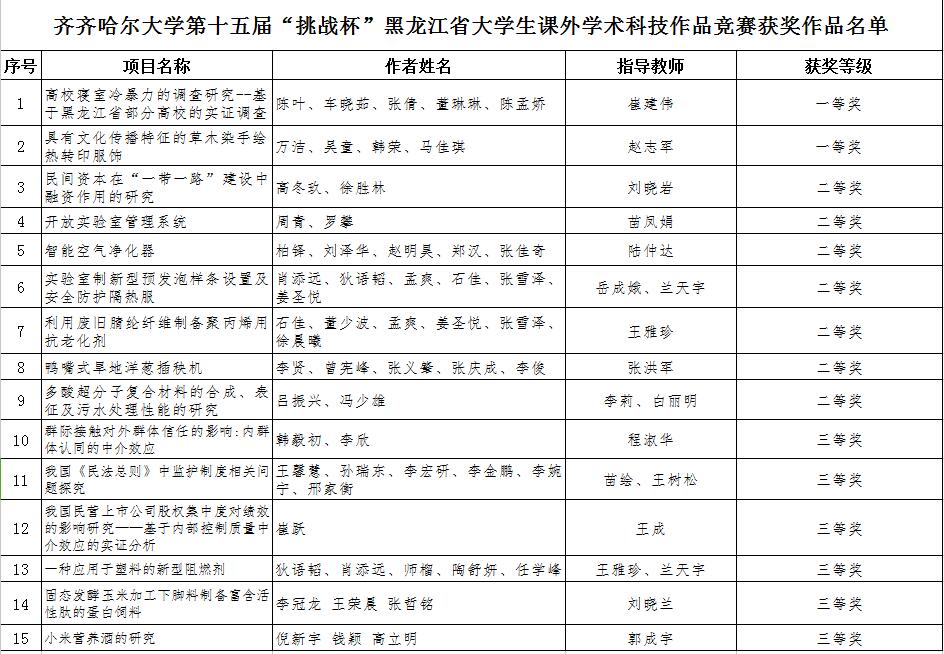 近日,由团省委、省教育厅、省科技厅、省社科院、省学联联合主办的第十五届“挑战杯”黑龙江省大学生课外学术科技作品竞赛决赛评审工作圆满结束,万象城有15项作品获奖,学校获得优秀组织奖。