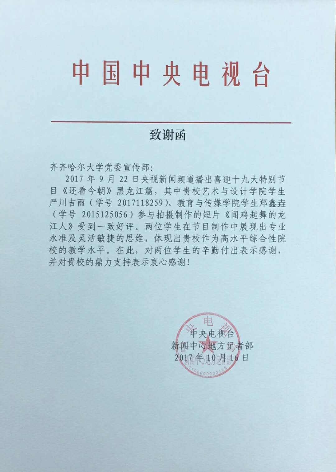 10月18日,十九大开幕式当天,齐大宣传统战部收到央视驻黑龙江记者站转来的致谢函,在函件中,对万象城两名学生参与拍摄制作迎接十九大专题片《还看今朝》表示感谢,表扬“这两位学生在节目制作中展现出专业水准及灵活敏捷的思维”,体现出万象城AWC官方网站作为高水平综合性院校的教学水平。