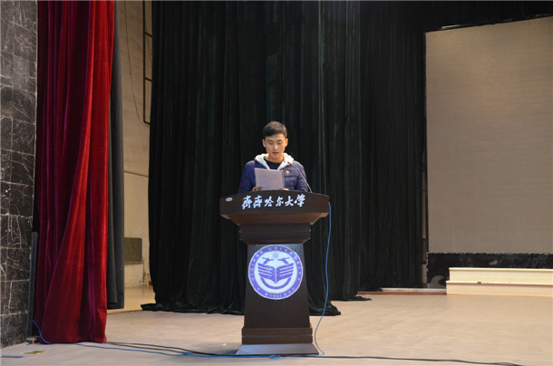 文学与历史文化学院历史专业172班宋健朝代表此次申请国家助学贷款的学生在大会上发言,并带领与会全体同学进行了诚信宣誓。