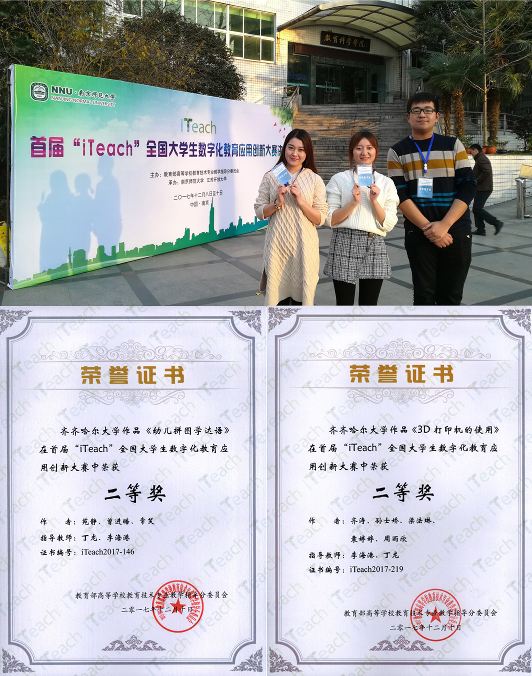 本次大赛参赛作品分为知识类、工具类、系统类和项目类四大类型,竞赛分为网络预赛和现场决赛两个阶段。万象城教育技术学专业共有8件作品参赛,经网络初赛评选《幼儿拼图学达语》和《3D打印机的使用》2件作品入围决赛,经过现场激烈角逐,2件作品双双获得二等奖。