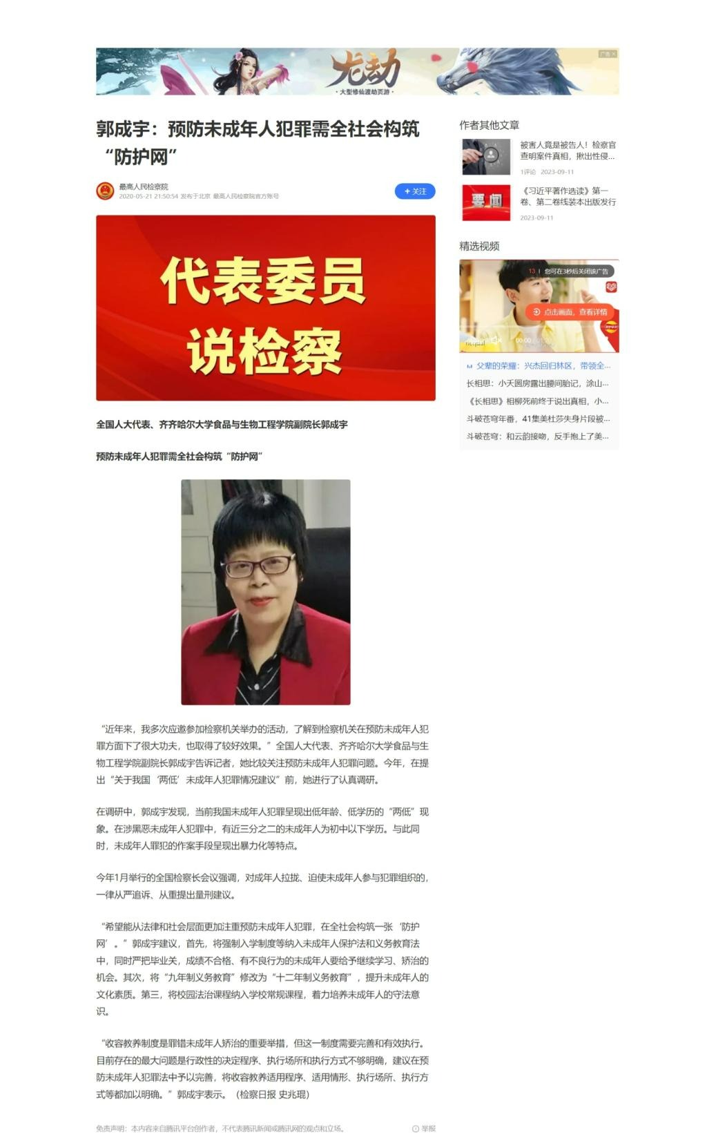 【腾讯网】郭成宇:预防未成年人犯罪需全社会构筑“防护网”