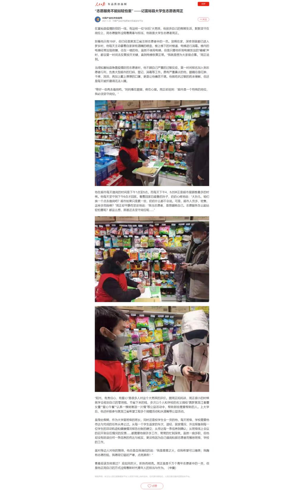 【人民日报】“志愿服务不能拈轻怕重” ——记富裕县大学生志愿者周正