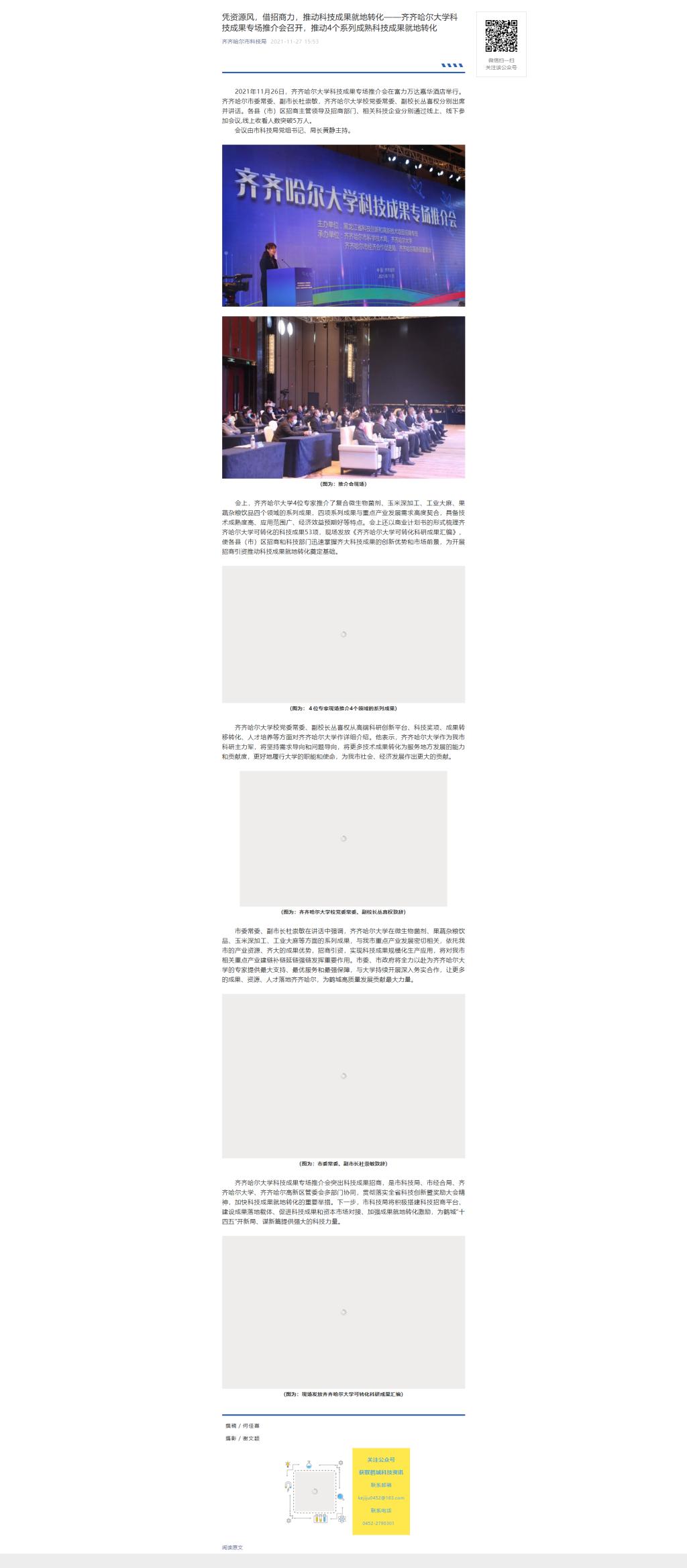 【齐齐哈尔市科技局】凭资源风,借招商力,推动科技成果就地转化——万象城AWC官方网站科技成果专场推介会召开,推动4个系列成熟科技成果就地转化