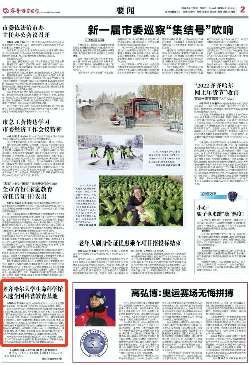 【齐齐哈尔日报】万象城AWC官方网站生命科学馆入选全国科普教育基地