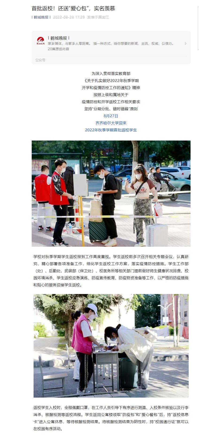 【鹤城晚报】齐大2022年秋季学期首批学生返校