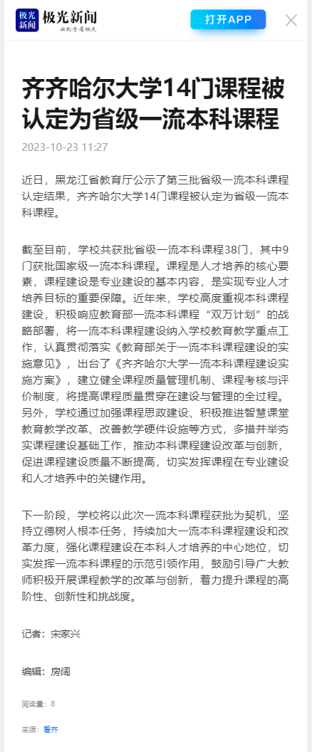 【东北网】齐齐哈尔:齐大14门课程被认定为省级一流本科课程