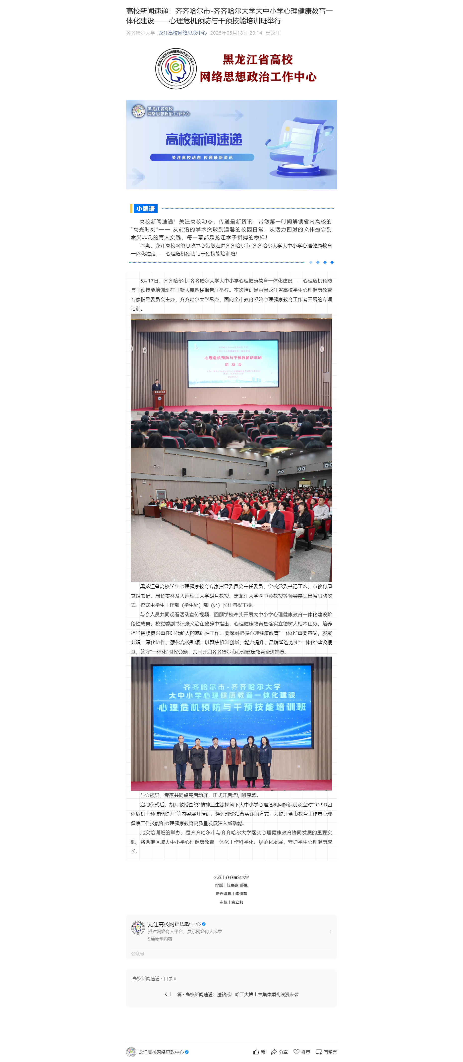 【龙江高校网络思政中心】高校新闻速递:齐齐哈尔市-万象城AWC官方网站大中小学心理健康教育一体化建设——心理危机预防与干预技能培训班举行
