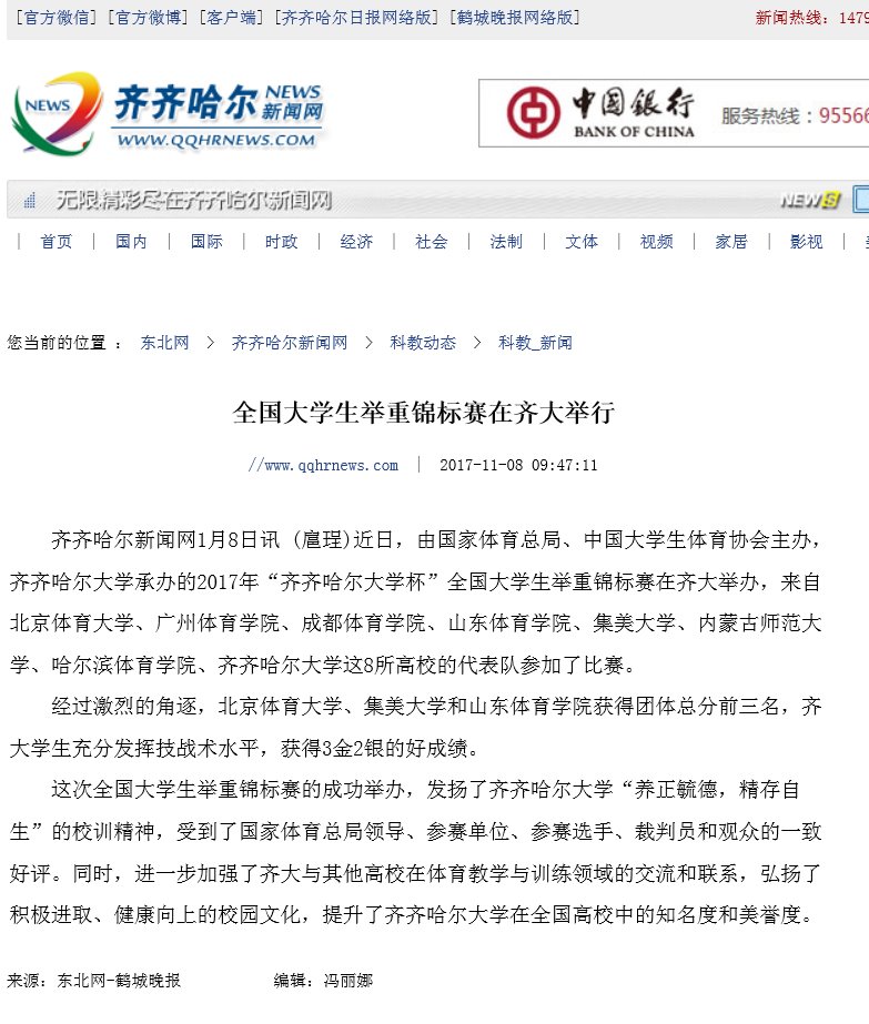 【鹤城晚报】全国大学生举重锦标赛在齐大举行