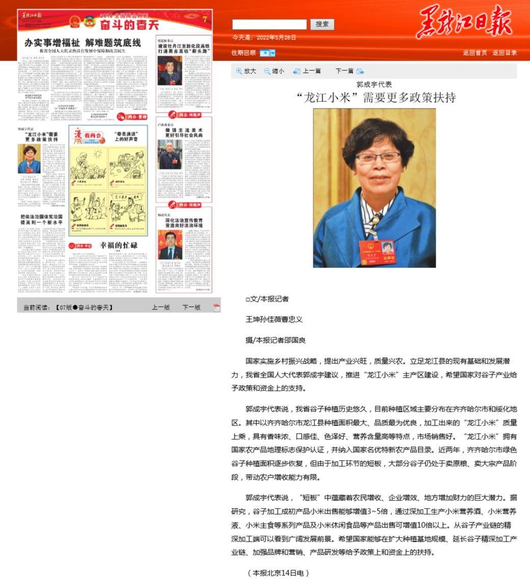 【黑龙江日报】郭成宇代表:“龙江小米”需要更多政策扶持