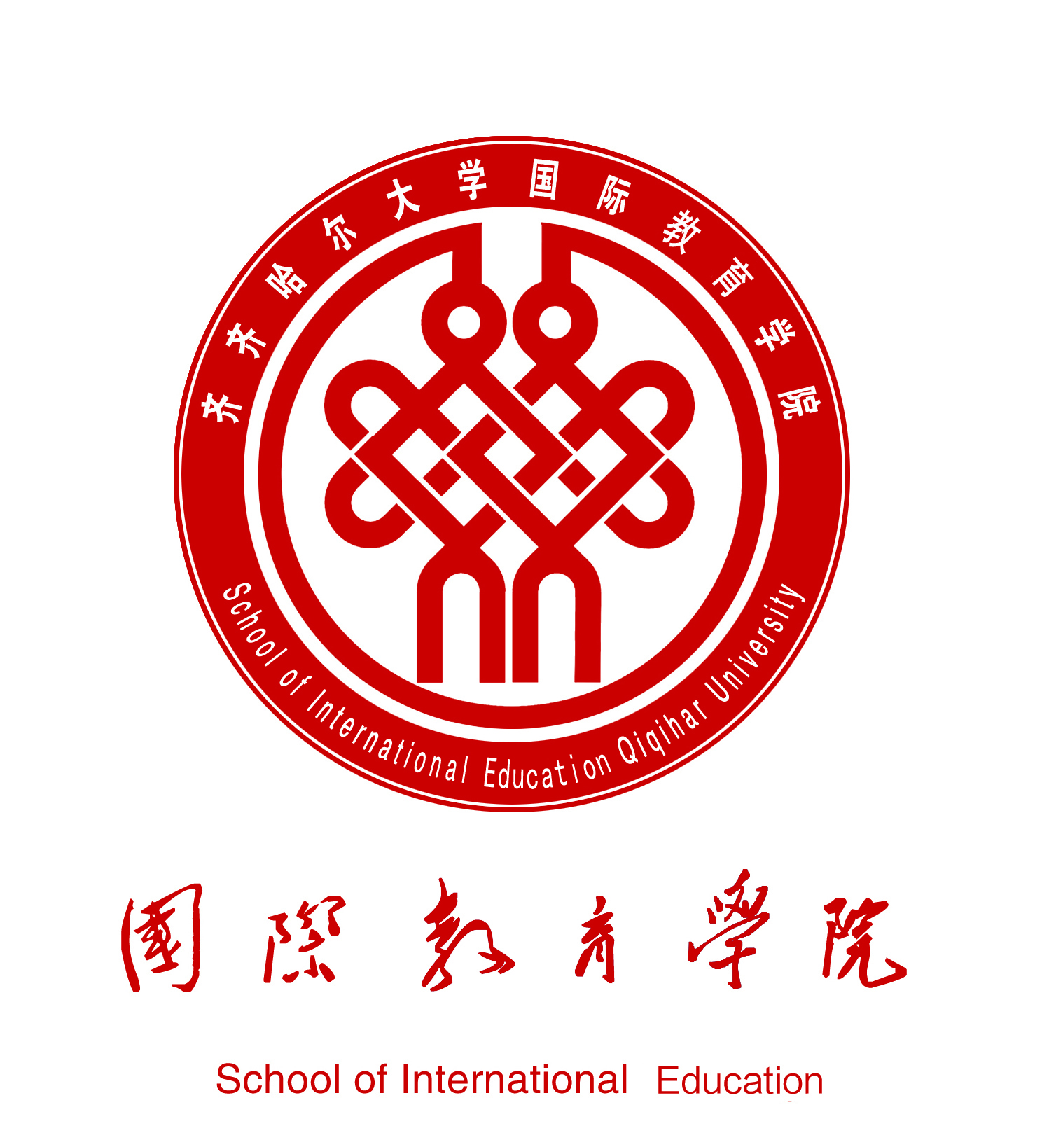 2.中国结中的方正结、同心结以及汉字“交”的拟人化变形,寓意着学院及中国文化的无限发展性和开放性,标志着与世界民族之林的心手相连、交流合作。